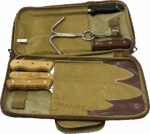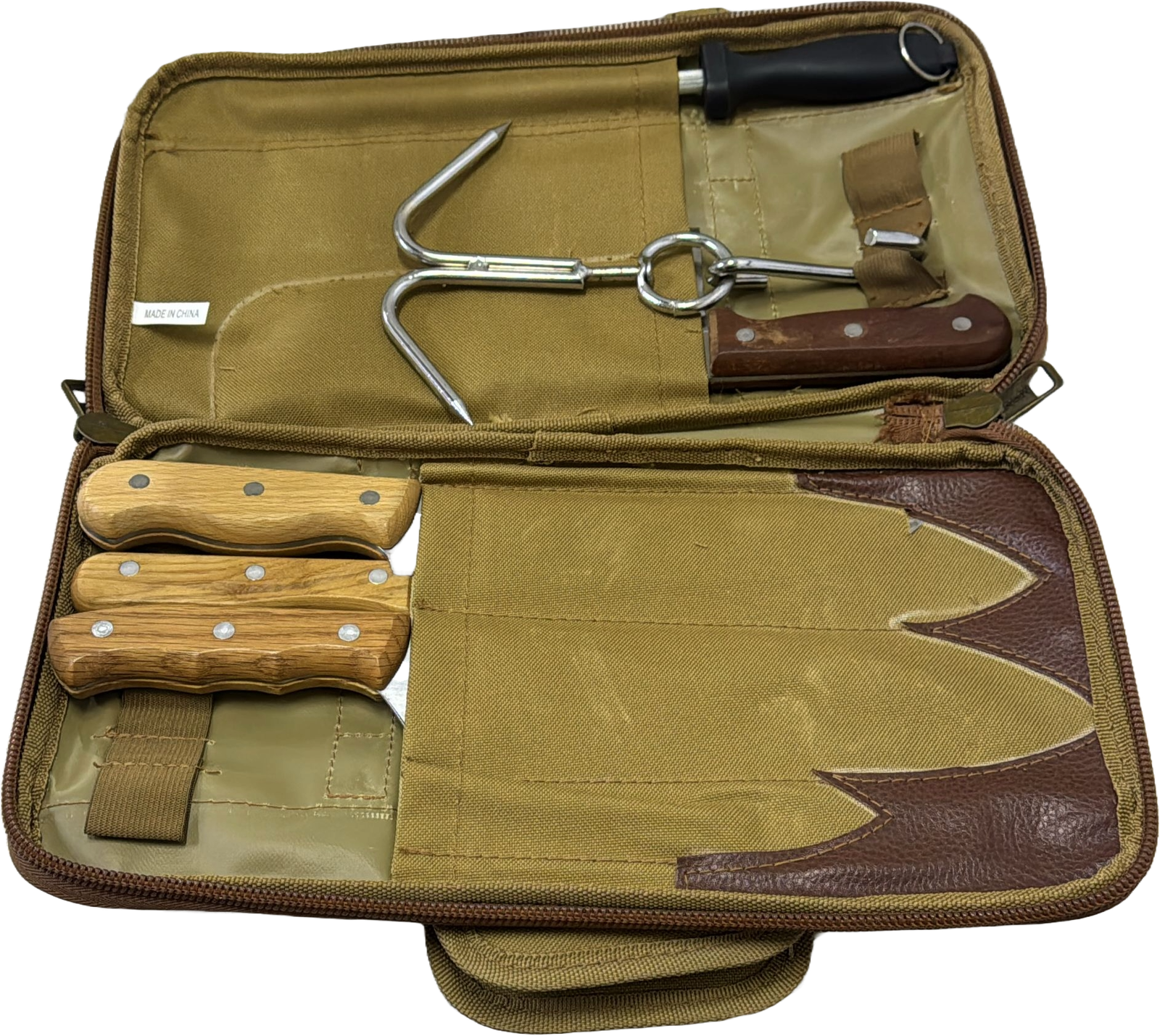 شنطة سكاكين مشتاق تحتوي علي 3 سكاكين بالحجام مختلفة وساطور ومسن مع شنكار دبل كل المحتويات بجودة عالية مع شنطة متينة التفصيل تجمع كل المحتويات